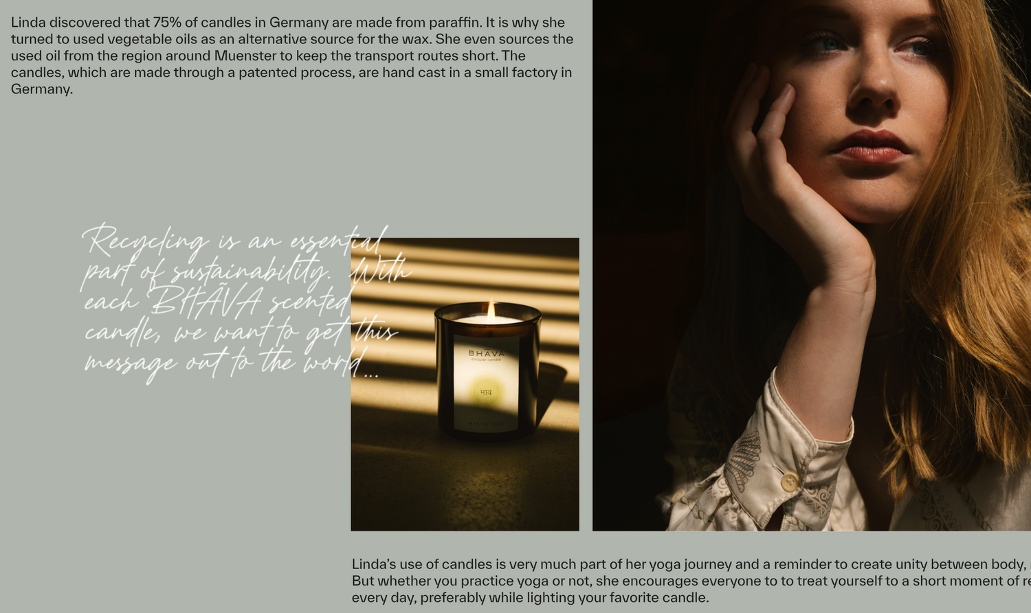 Somit ging das Gründerteam, bestehend aus Linda und Christian, auf die Suche nach natürlichen, aber auch ästhetisch ansprechenden Duftkerzen, die man nicht nur während der Yogastunde entzünden möchte, sondern auch gemütlich Zuhause auf der Couch.